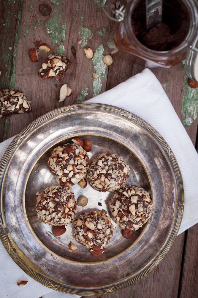 Gick igenom lite gamla bilder idag och upptäckte att jag ju inte delat med mig av det här helt fantastiska receptet på nutellabollar. Alltså dra mig baklänges va gott! Typ som chokladbollar, fast kanske tusen gånger godare. Det är ju ändå nutella i liksom. Och det allra bästa med detta recept, det är ju att om du gör helt egen nutella, ja då är de inte så värst onyttiga. Bara fullproppade med härlig energi från nötter och kokos. Alltså perfekt att ta till på eftermiddagen sådär i 15-klippet när man börjar bli lite hungrig och väldigt sötsugen. Problemet är väl mest att det är stört omöjligt att bara äta en….