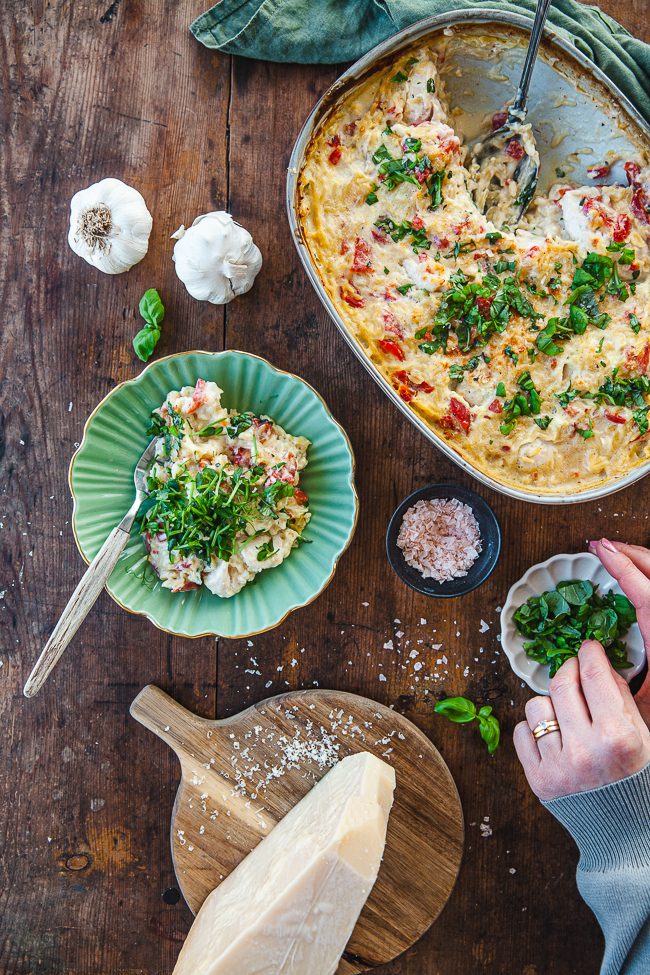 Hur bra låter inte det? Anledningen är att du liksom inte behöver kunna laga mat. Alla smaker finns redan där. I den grillade paprikan, i färskosten, i basilikan och i parmesanen. Allt läggs i en ugnsform och 30 minuter senare har du en drömgod middag klar. Utan större ansträngning alls.