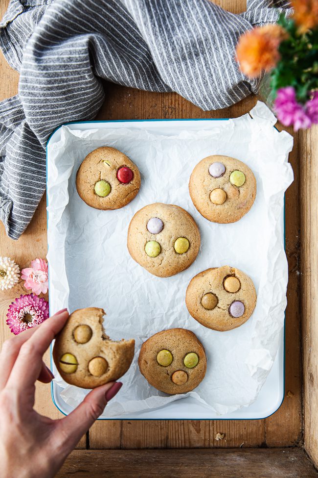 Ute blåser aprilvindar, men solen skiner och temperaturen arbetar sig upp mot varma 15 plusgrader. Något som nästan känns som sommarvärme efter denna evighetslånga vargavinter. Då passar det fint med en riktigt god kaka till förmiddagskaffet. Varför inte en seg cookie med smak av smarties?