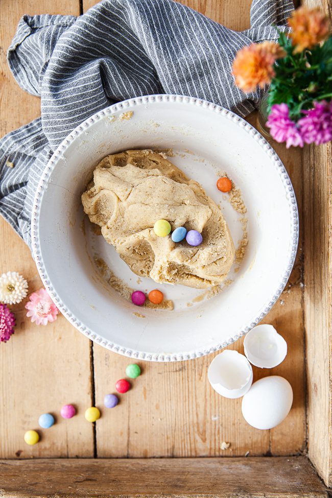Vispa smör och socker fluffigt, tillsätt ägget och fortsätt vispa. Rör sedan i mjöl, bakpulver och vanilj. Ha i smarties. Arbeta snabbt ihop till en smidig deg. Plasta in och låt vila ca 20 minuter i kylskåpet.