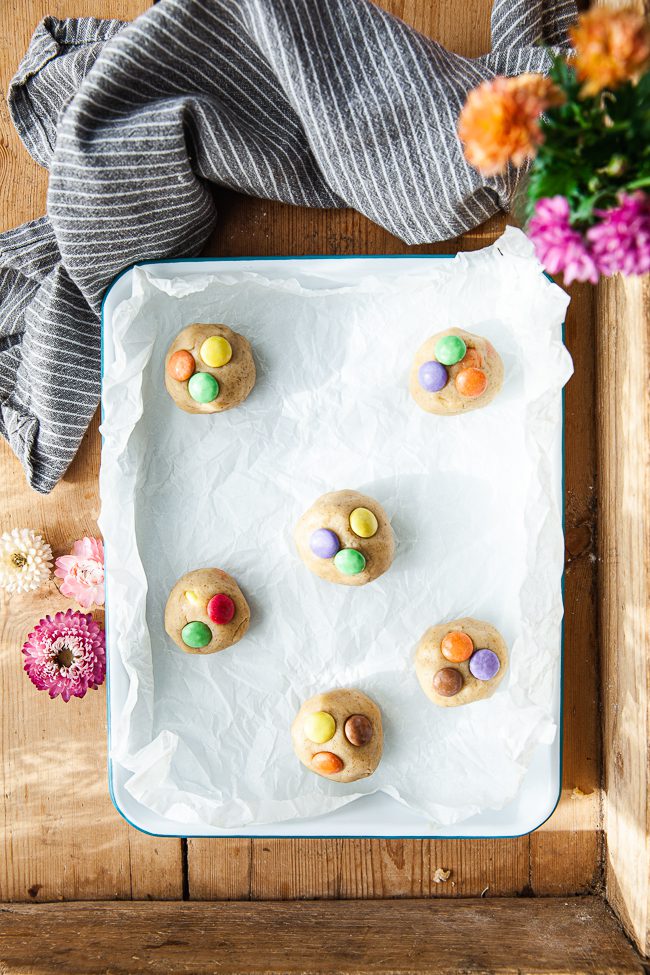 Tag ut och gör runda bollar av degen. Lägg ut på bakplåtspappersklädd plåt. Kakorna flyter ut något så se till att de har gott om utrymme. Tryck i ett par smarties på varje kakbit.